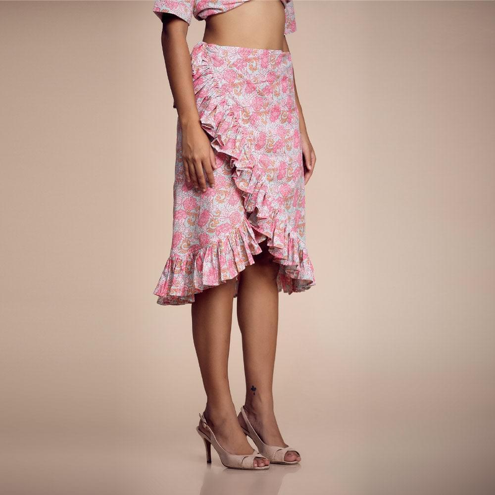 Block/screen printed wrap-around skirt with 2 adjustable tie-ups. It can be paired with a plain/slogan tee or our printed crop shirt and can be worn as a co-ord.