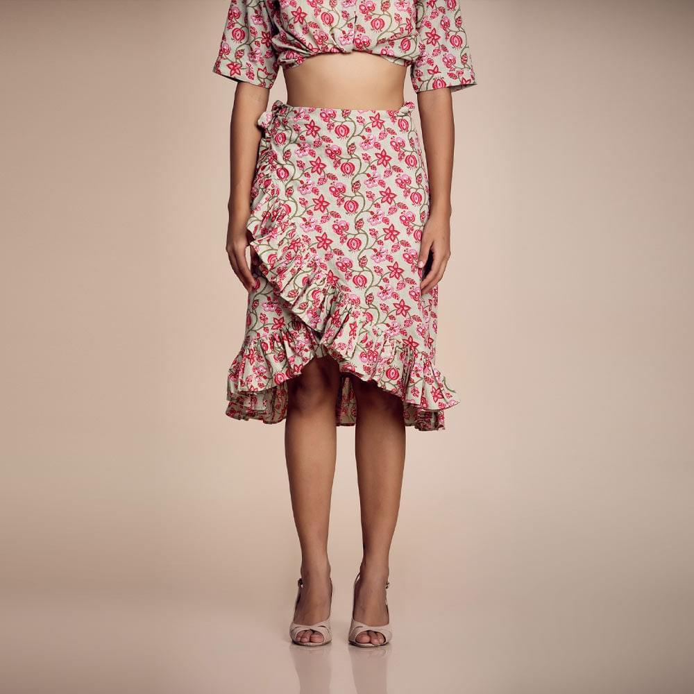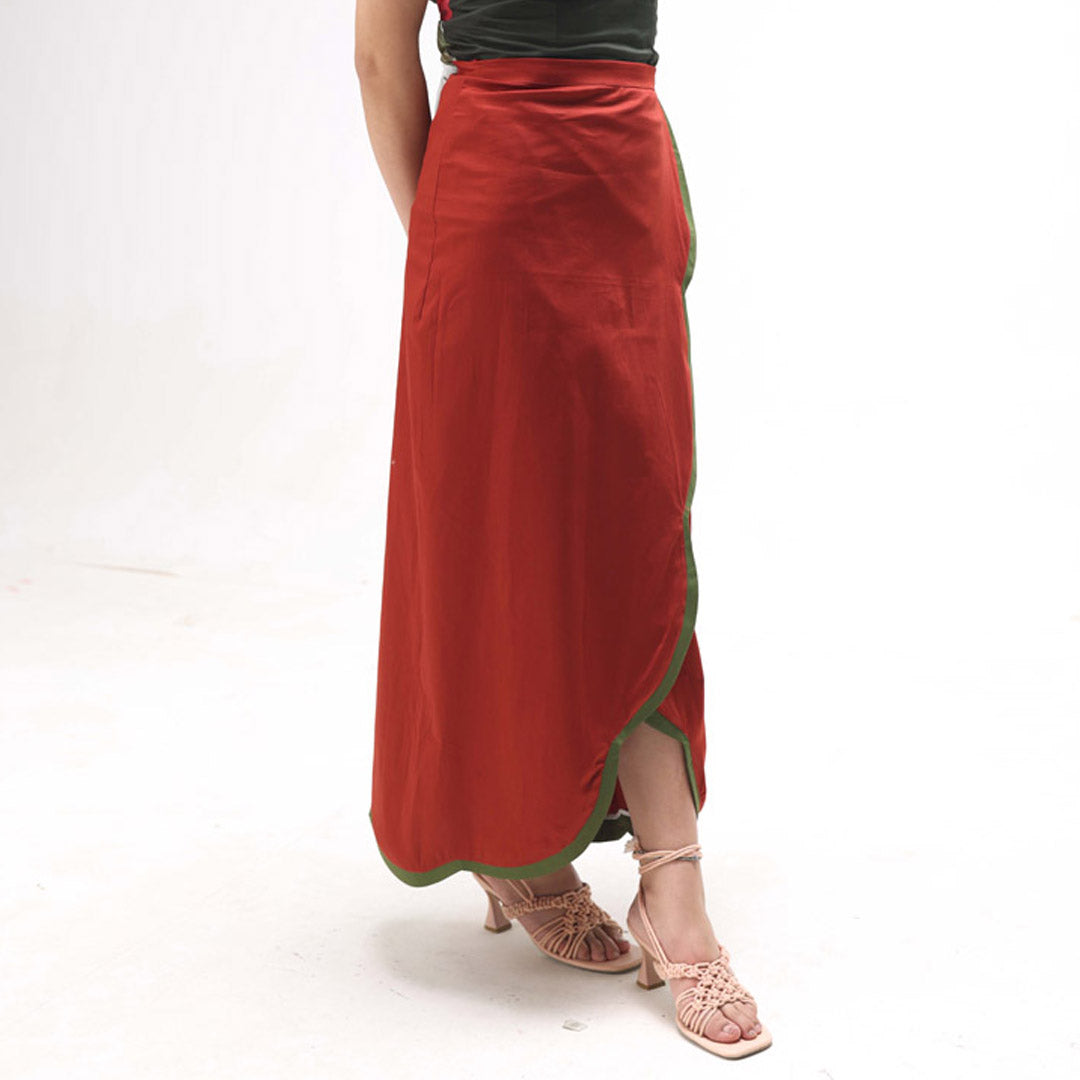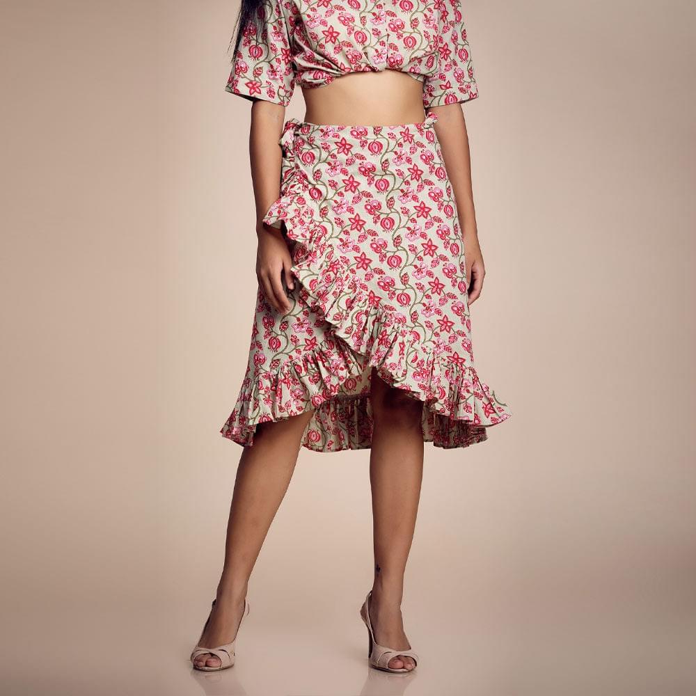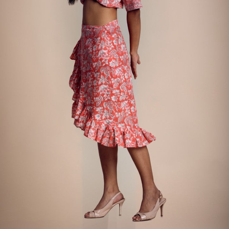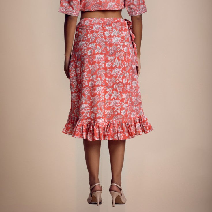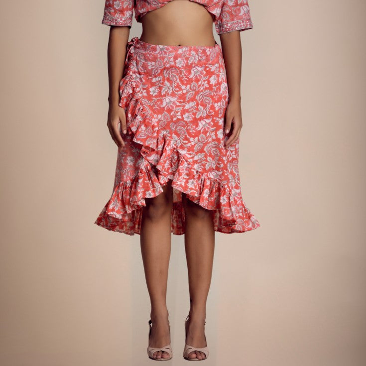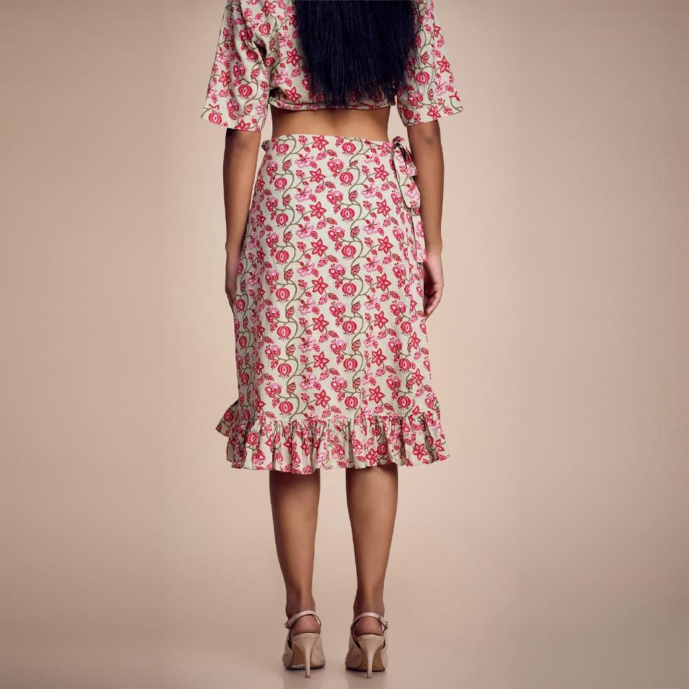 Garden Delight: Red-Green Floral Printed Cotton Skirt for Stylish Flair