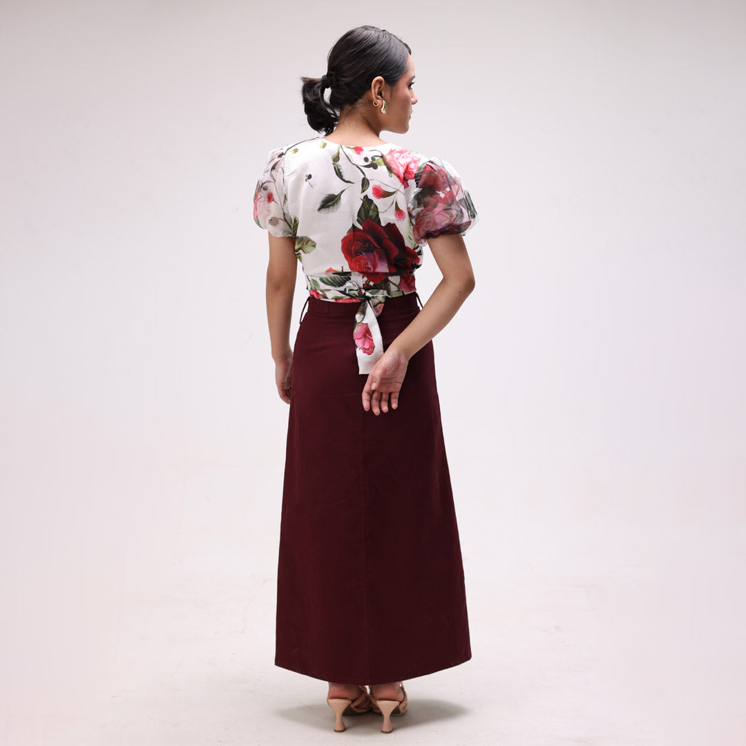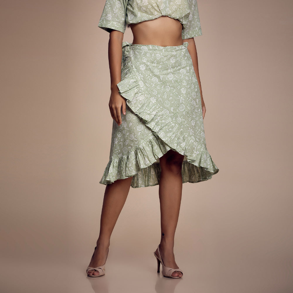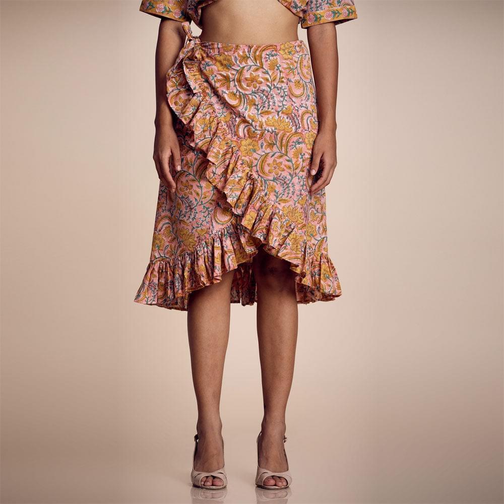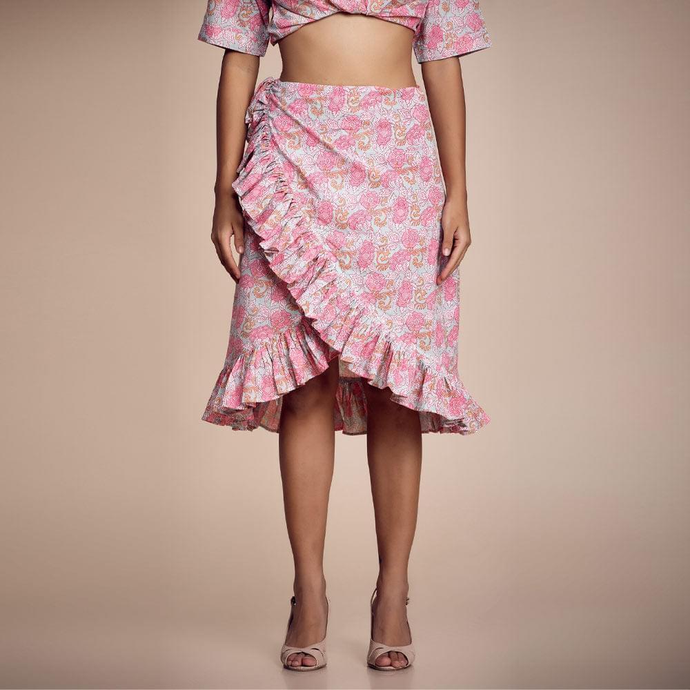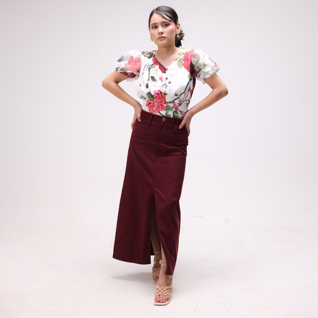 Garden Delight: Red-Green Floral Printed Cotton Skirt for Stylish Flair