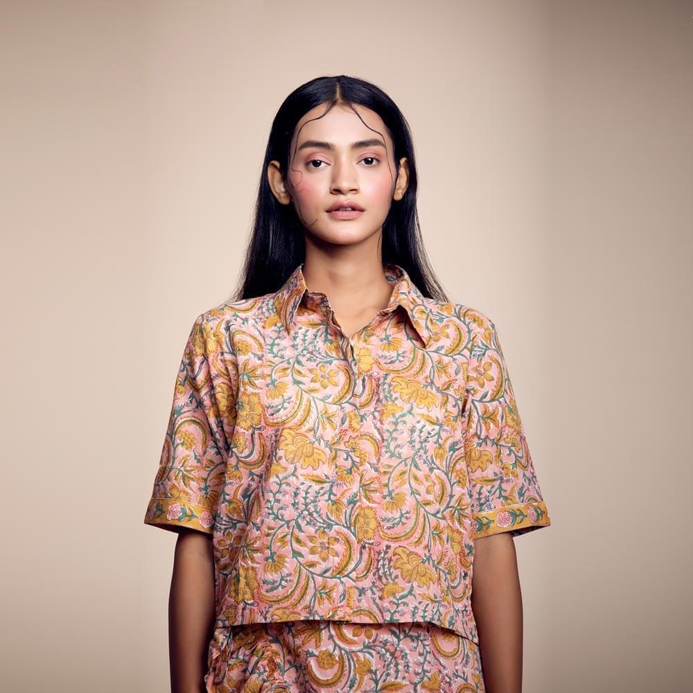 Terra Chic: Trendy Burnt-Orange Cotton Printed Crop Shirt for Fashion-forward Looks