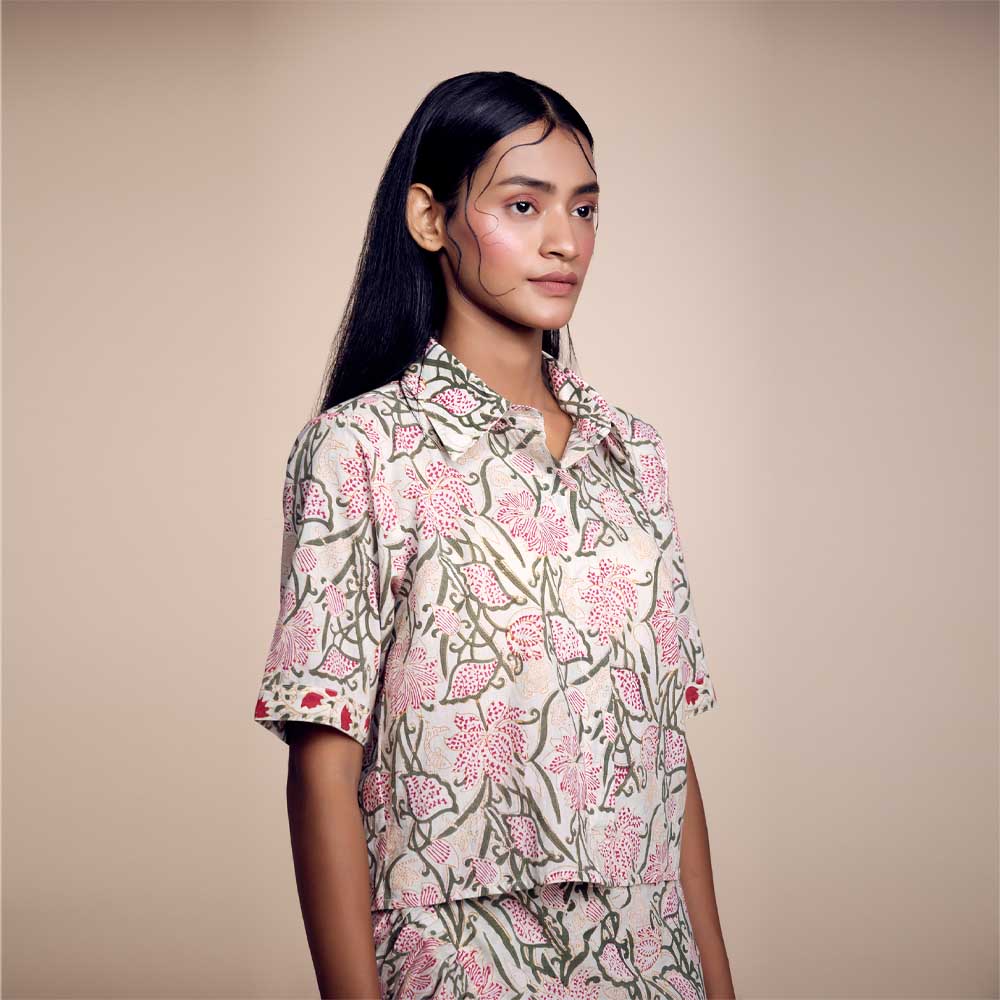 The block/screen printed crop shirt has half sleeves with a straight collar. Comes with a hidden button-down placket for easy opening. Has a relaxed fit and is 17 inches in length. The model is wearing size S.
