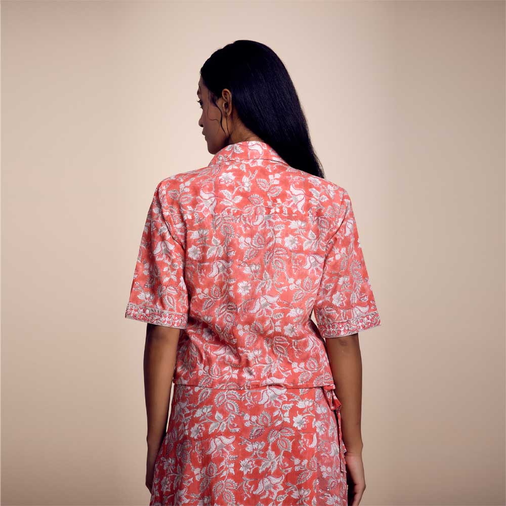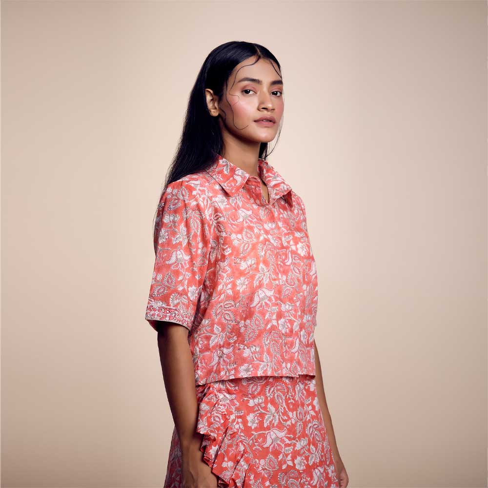 The block/screen printed crop shirt has half sleeves with a straight collar. Comes with a hidden button-down placket for easy opening. Has a relaxed fit and is 17 inches in length. The model is wearing size S.