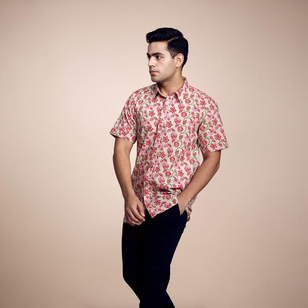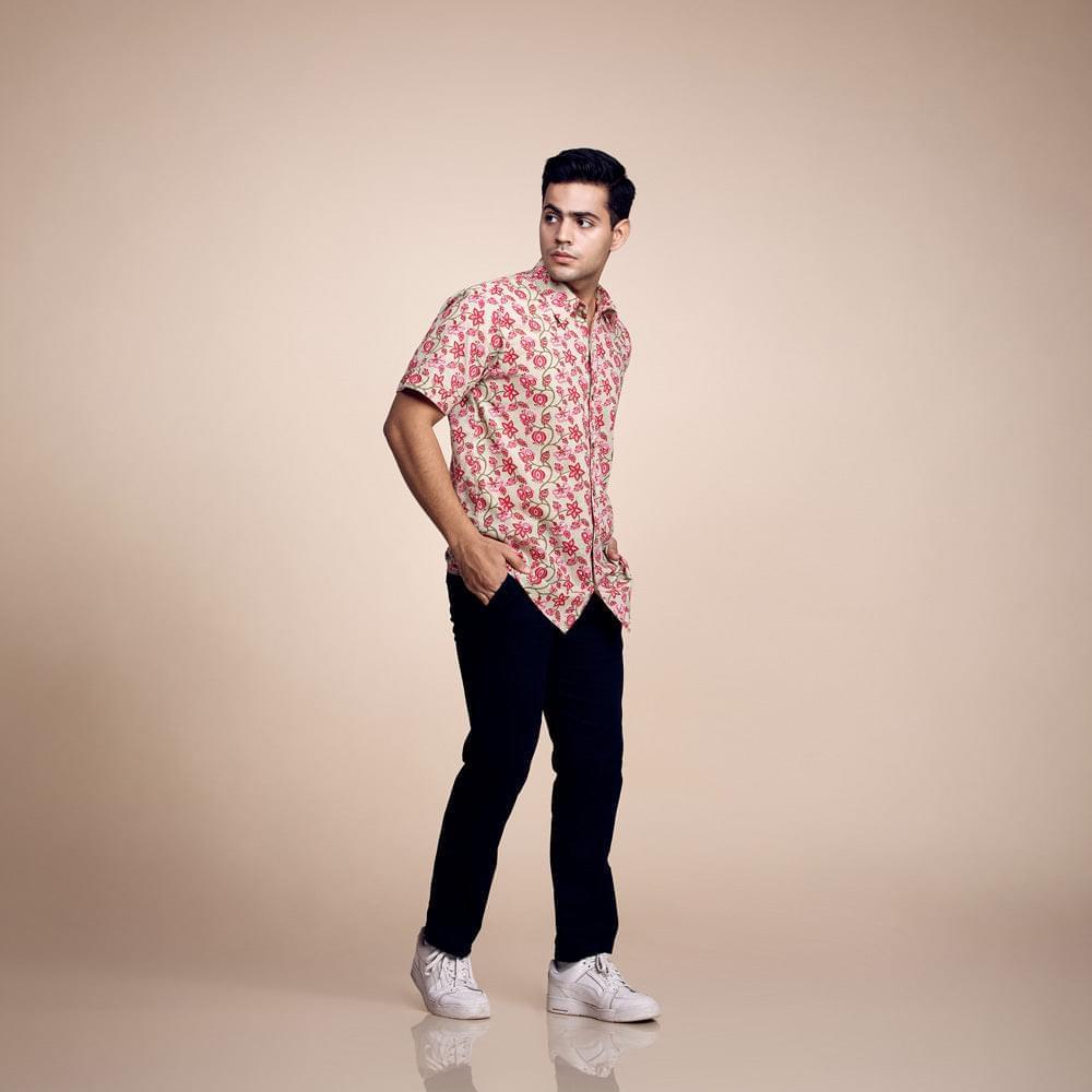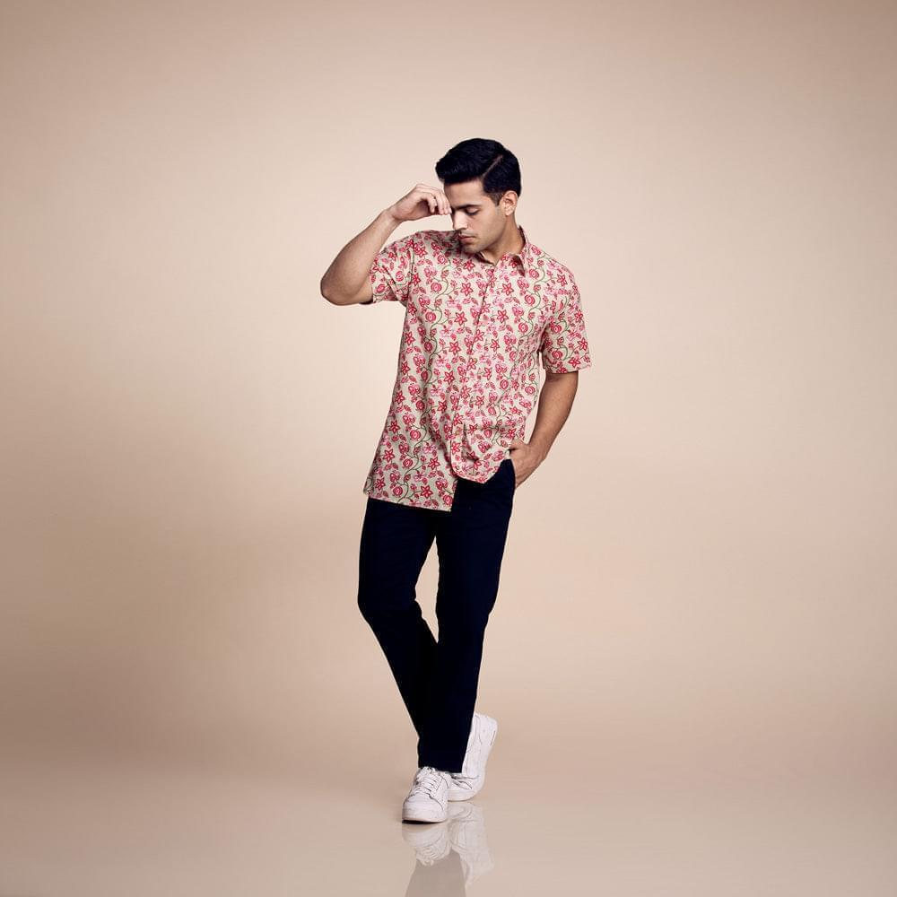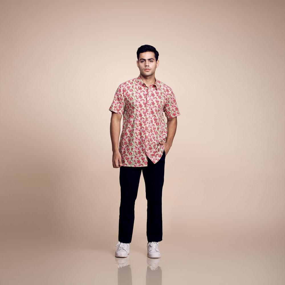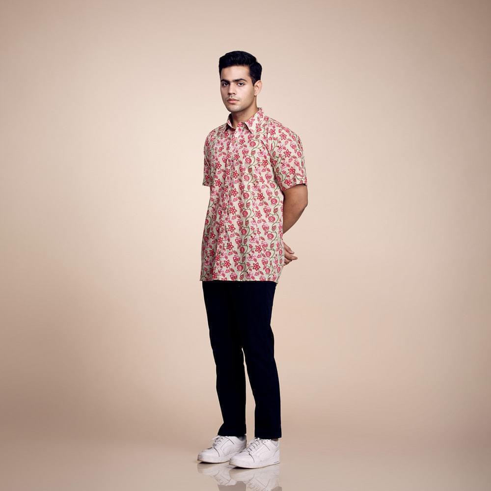 Botanical Bliss: Red-Green Floral Cotton Printed Shirt with a Stylish Twist