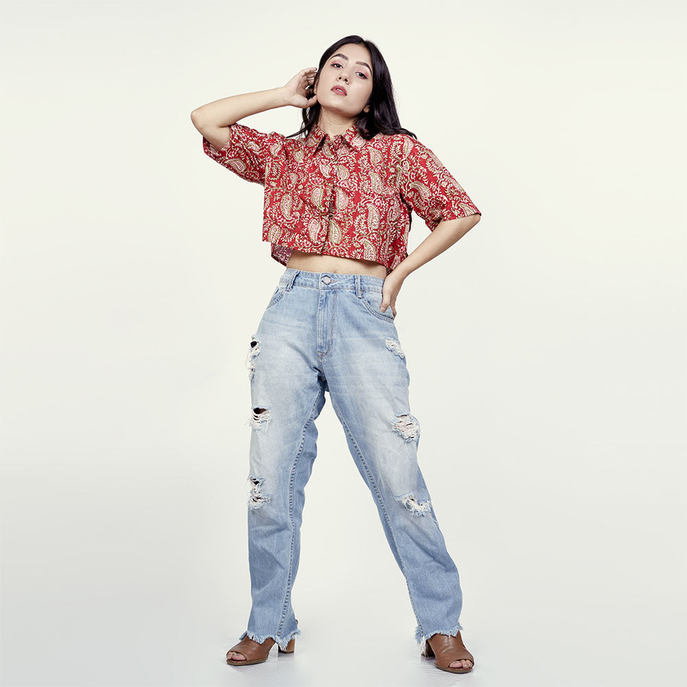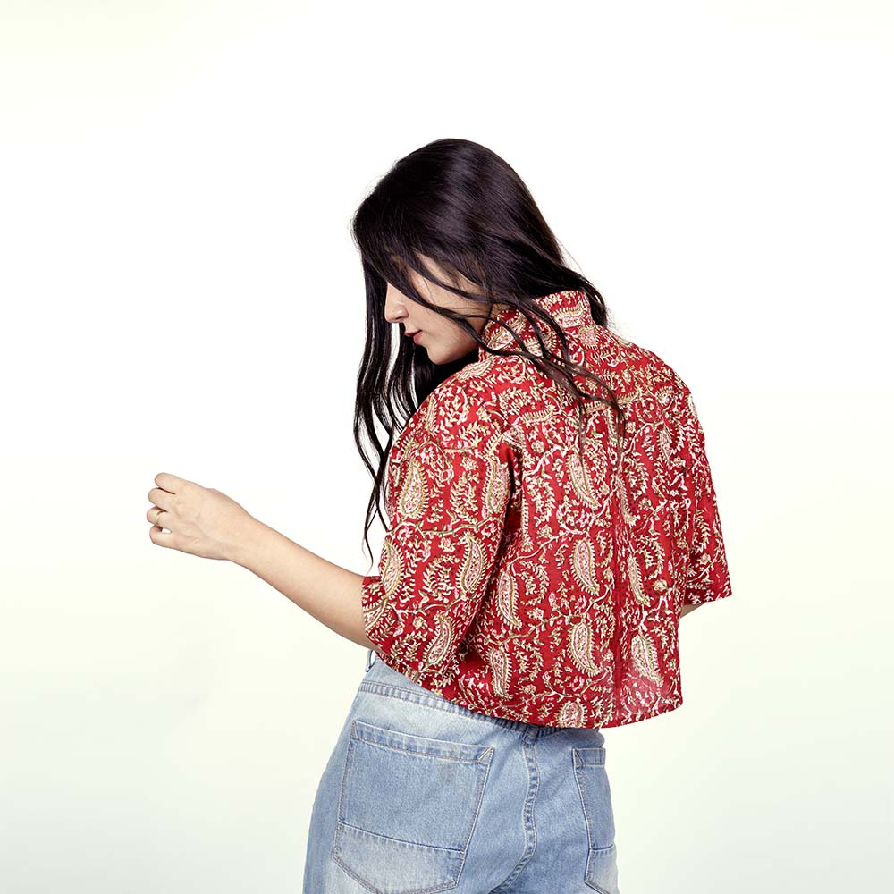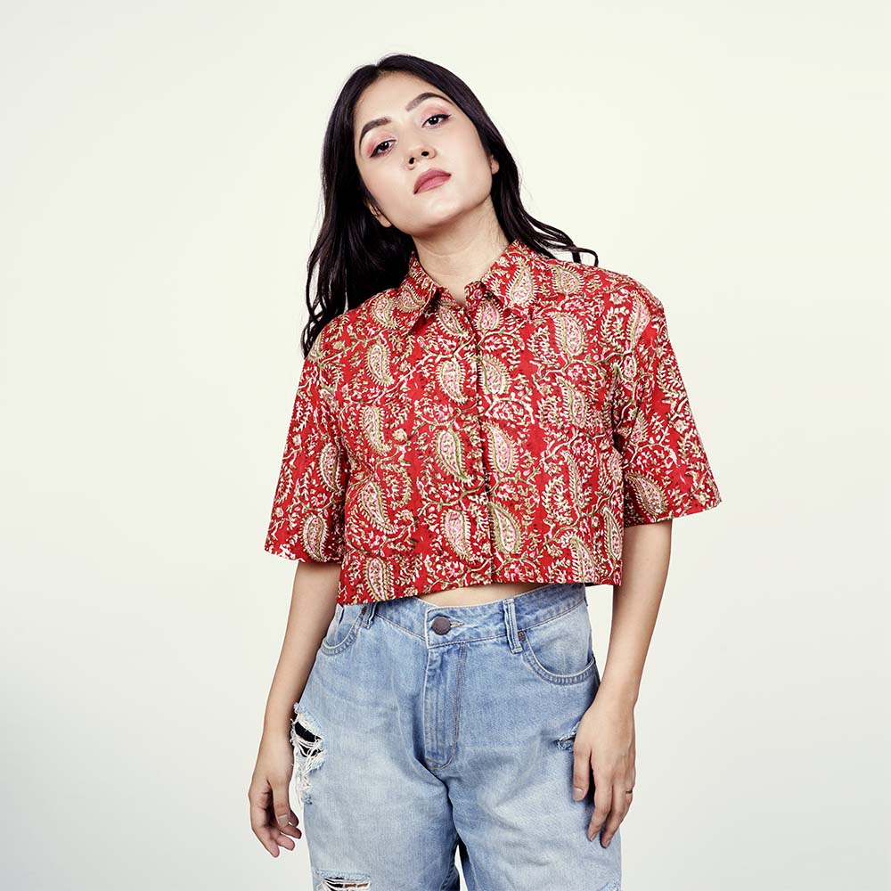Scarlet Chic: Trendy Red Cotton Crop Shirt for Stylish Impact