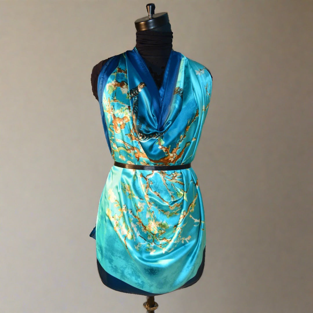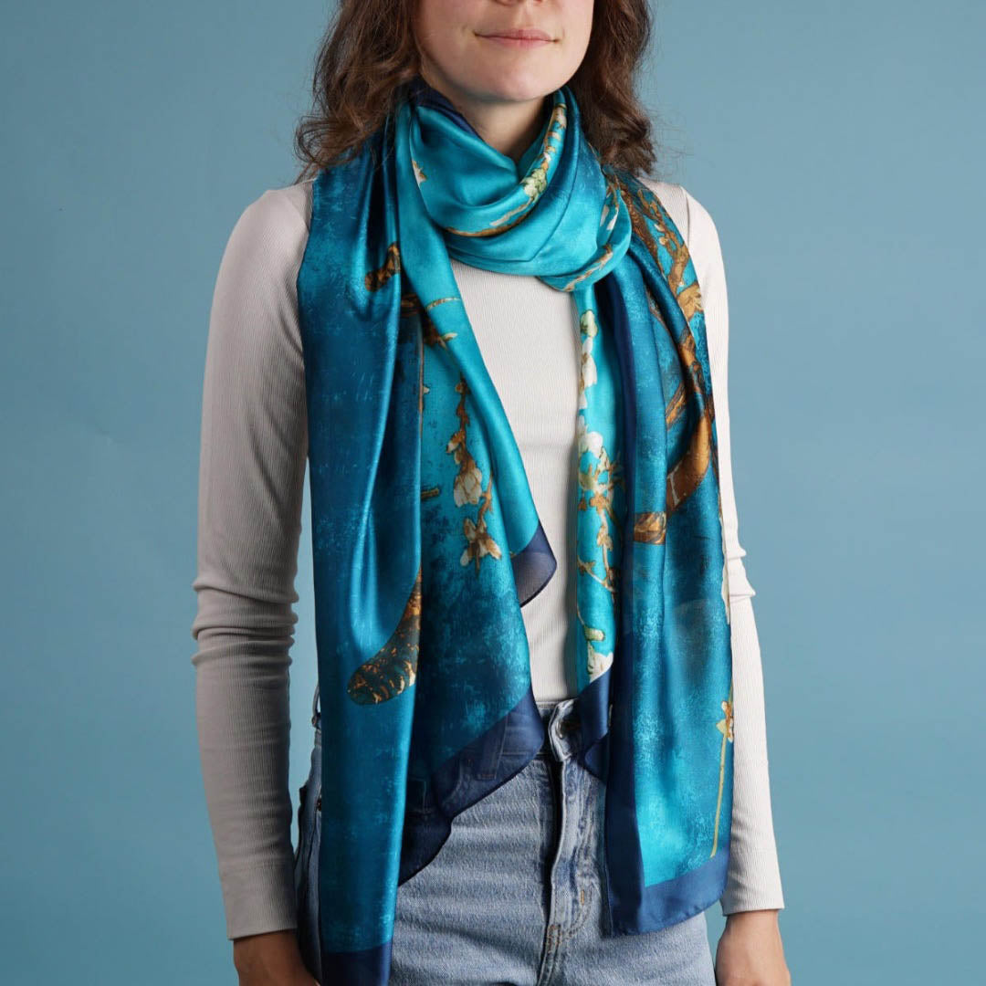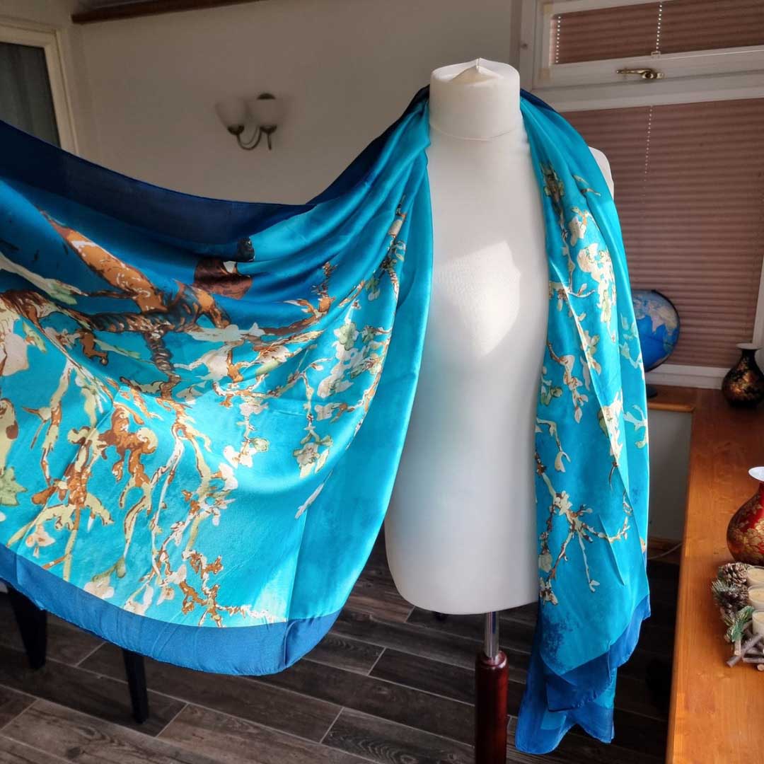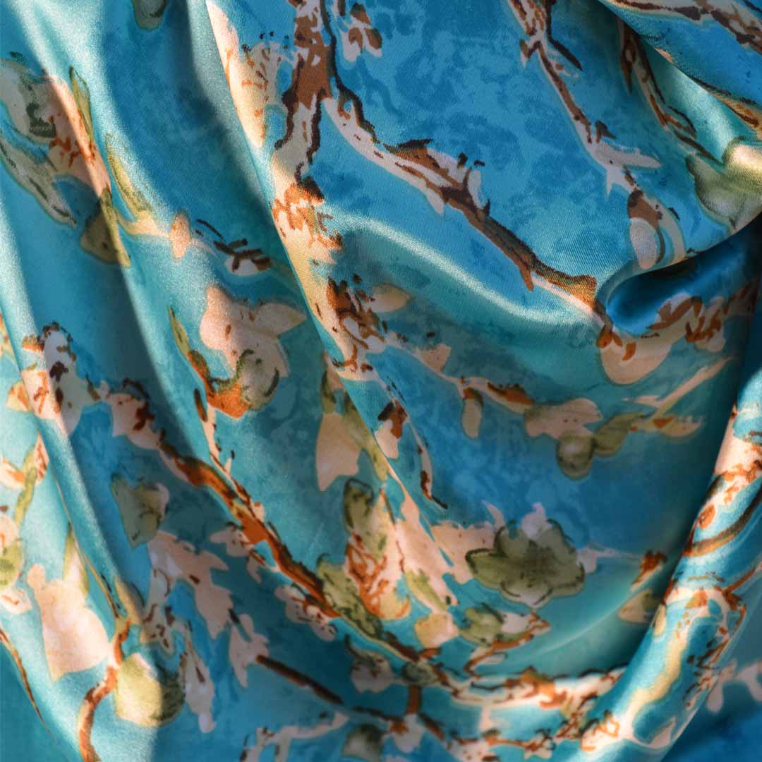 Elevate your look with our Aqua Mirage Satin Stole. Featuring beautiful aqua shades and a delicate cherry blossom print, this unique stole adds a touch of class to any outfit. Allow yourself to stand out in a crowd with this sophisticated and exclusive piece.
