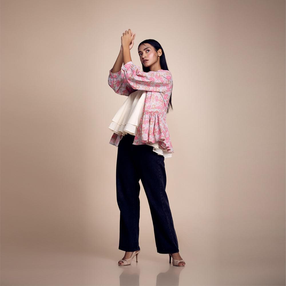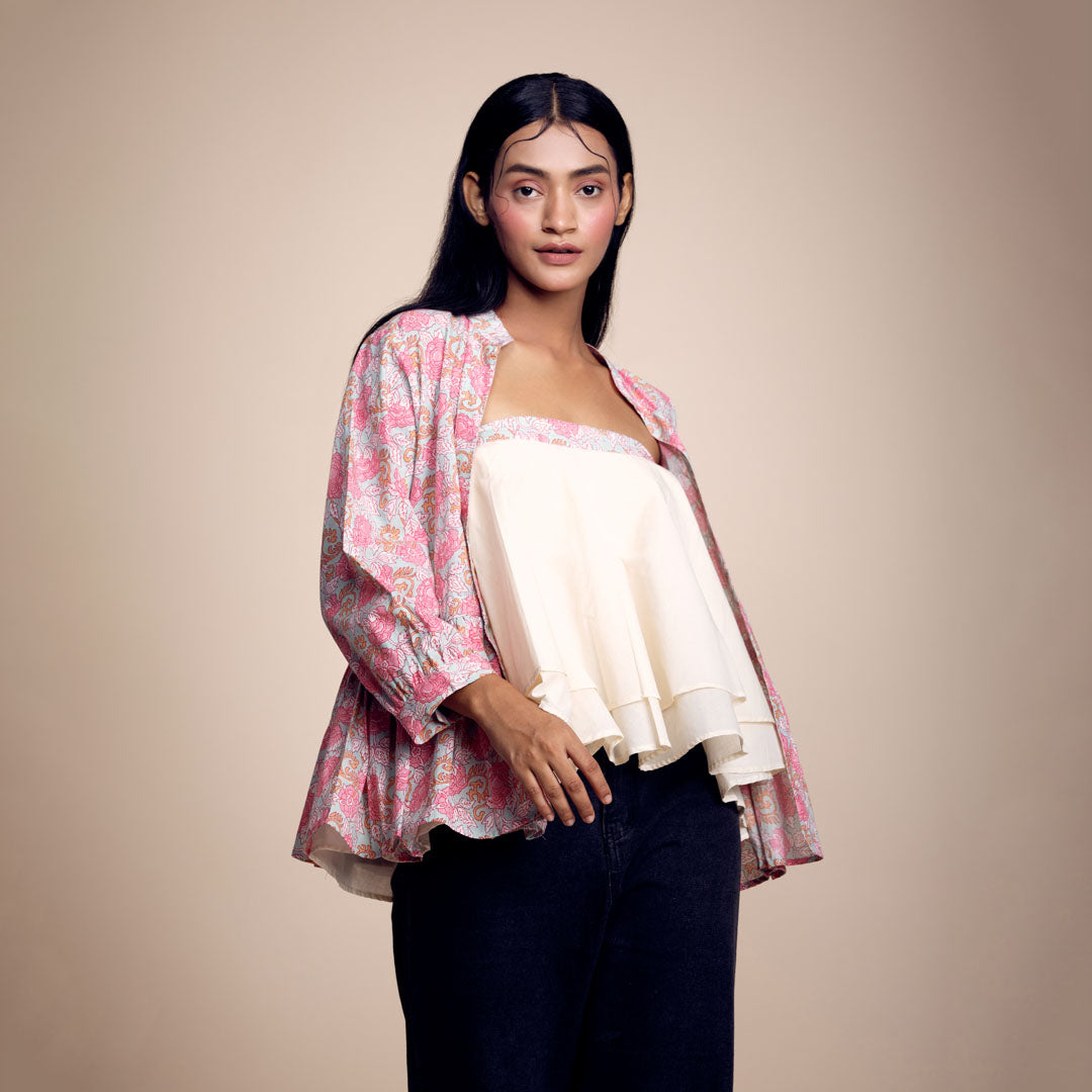 Whimsical Harmony: Blue-Pink Printed Cotton Jacket & Tube Top Set