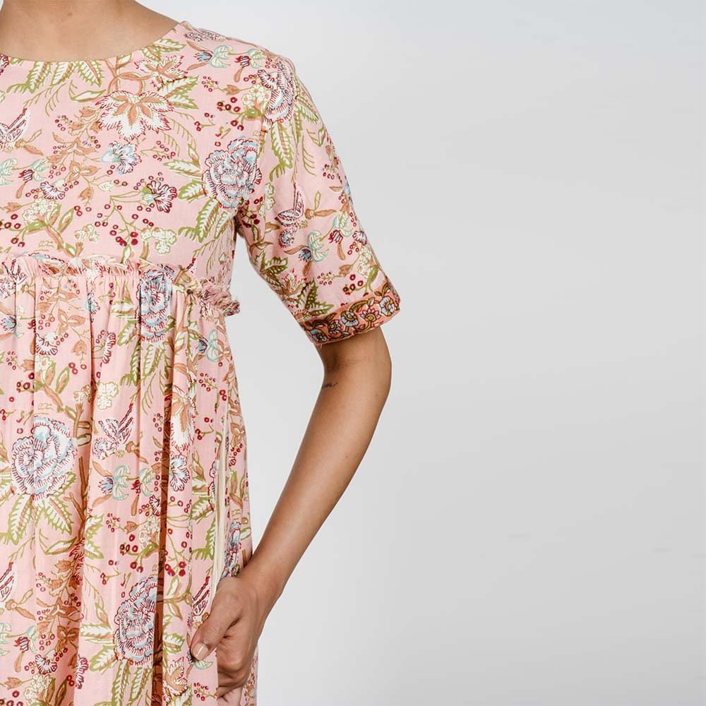 The Block/Screen printed high side slit Kurti has gathered detail on the chest line as well as at the back and border detail on sleeves. It has mulmul lining inside with gathered detail at the bottom. It has Fabric button loop closure at the back.