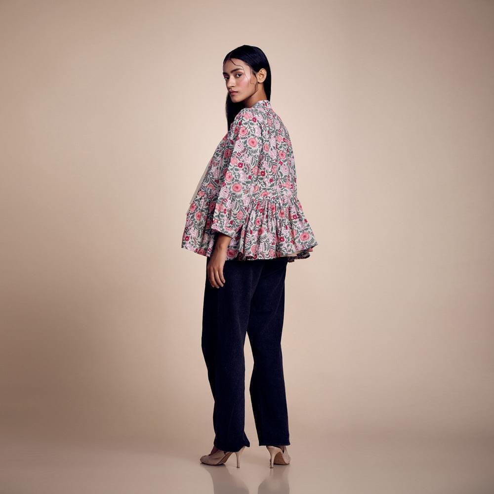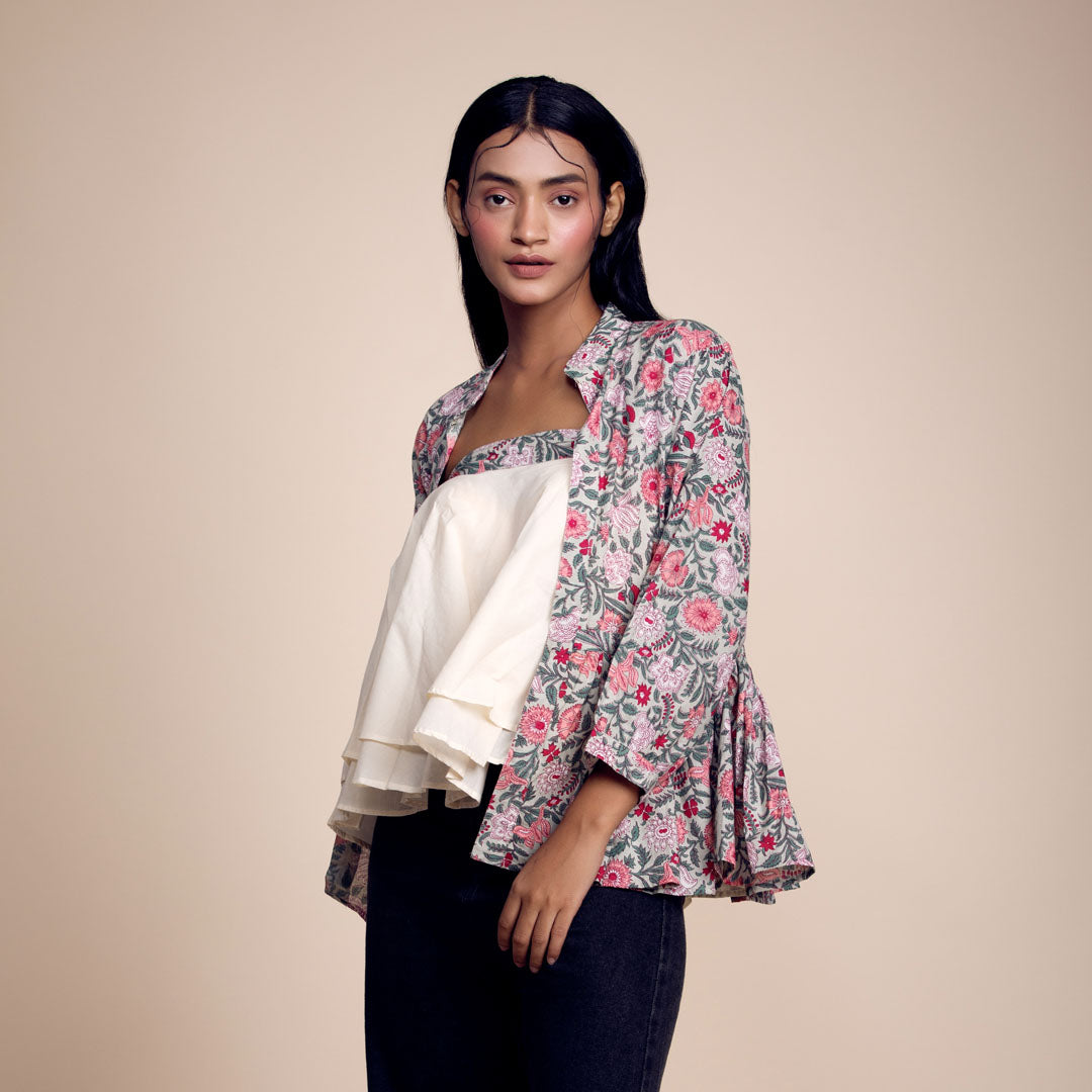 Floral Finesse: Trendy Green-Pink Printed Cotton Jacket with Tube Top Set for Chic Coordination