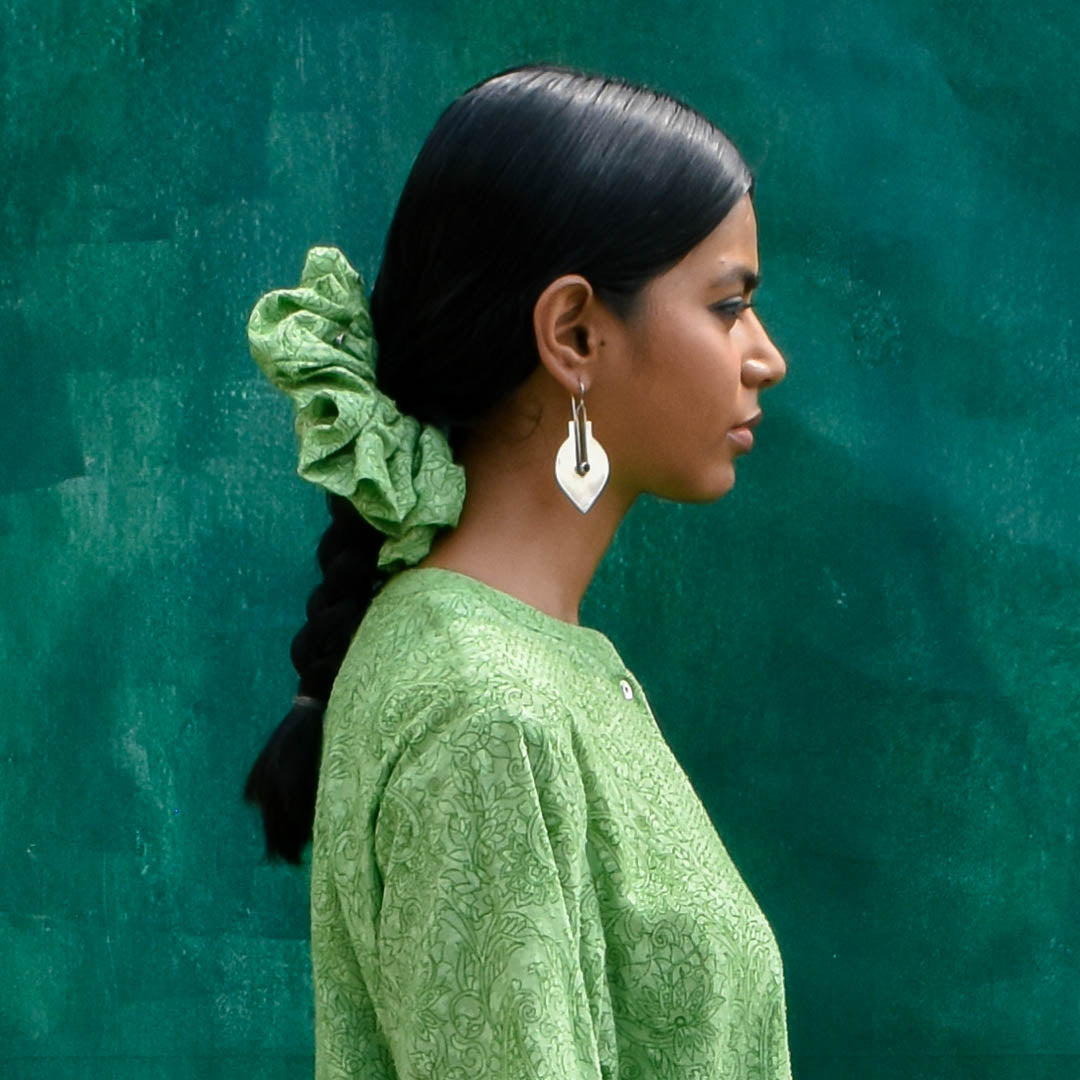 Indulge in the luxurious elegance of our Hellebore Scrunchie. Made with organic cotton and constructed from upcycled waste, this oversized scrunchie adds a touch of green to your accessories collection. Elevate your style while reducing your environmental impact with this exclusive piece.