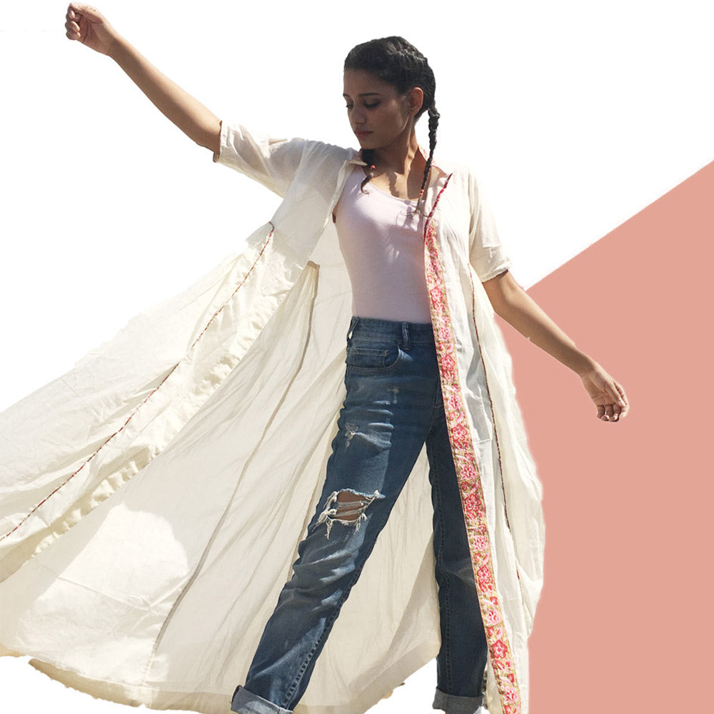 Loose Fit, Hand block printed, Indo-western, Jacket /Shrug. It has border detail in the front and button front opening.