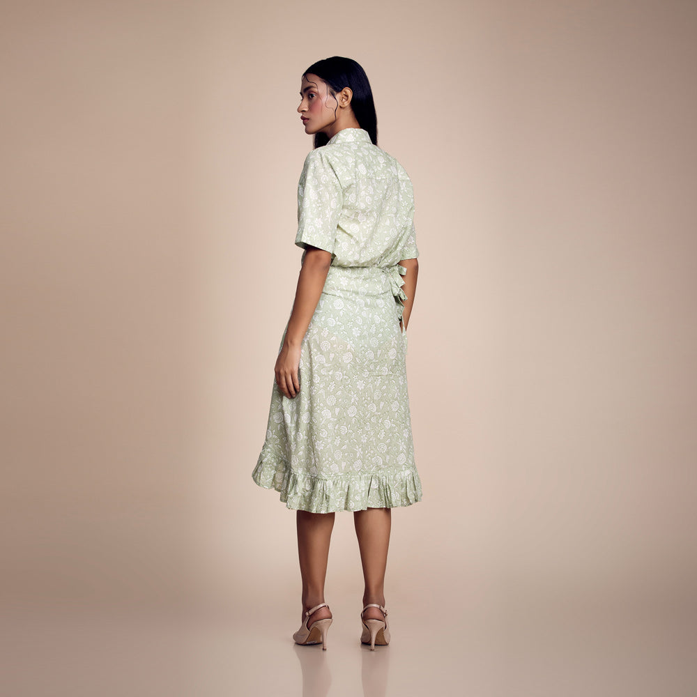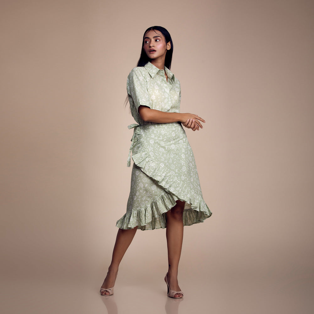 Look classy boho-chic in this uber-stylish printed cotton crop shirt & skirt set for women. Designed for those fashionably driven and sophisticated women who love to express their style. This Co-ord features a collared neckline and straight half sleeves with floral block print all over. Teamed with this is a frilled wrap-around skirt printed in block appearing as a floral pattern. This cropped shirt can also be paired with jeans/pants/skirts and a skirt can be paired with plain/slogan tees or shirts. Finish it off with nude or tan flats.