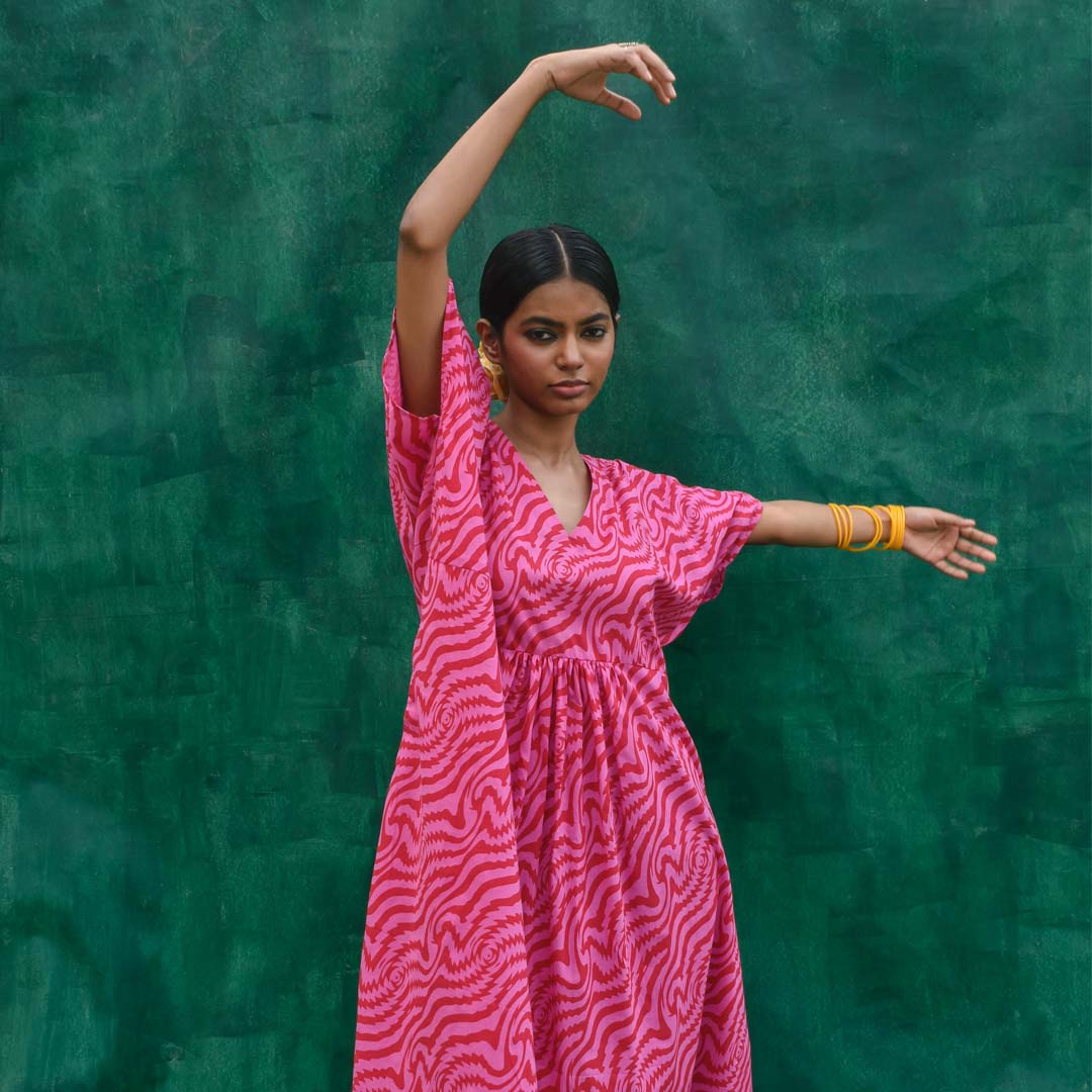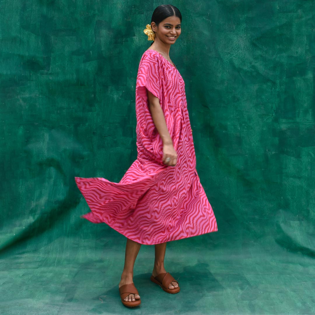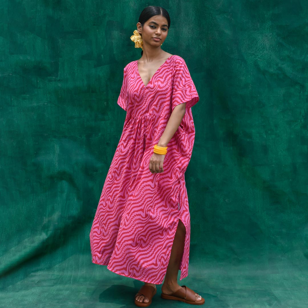 Stay stylish and comfortable in this organic Rani Kaftan in a beautiful mix of two shades of pink. Perfect for any occasion and crafted with only the classiest materials. Feel confident knowing you're dressed in fashion and comfort.