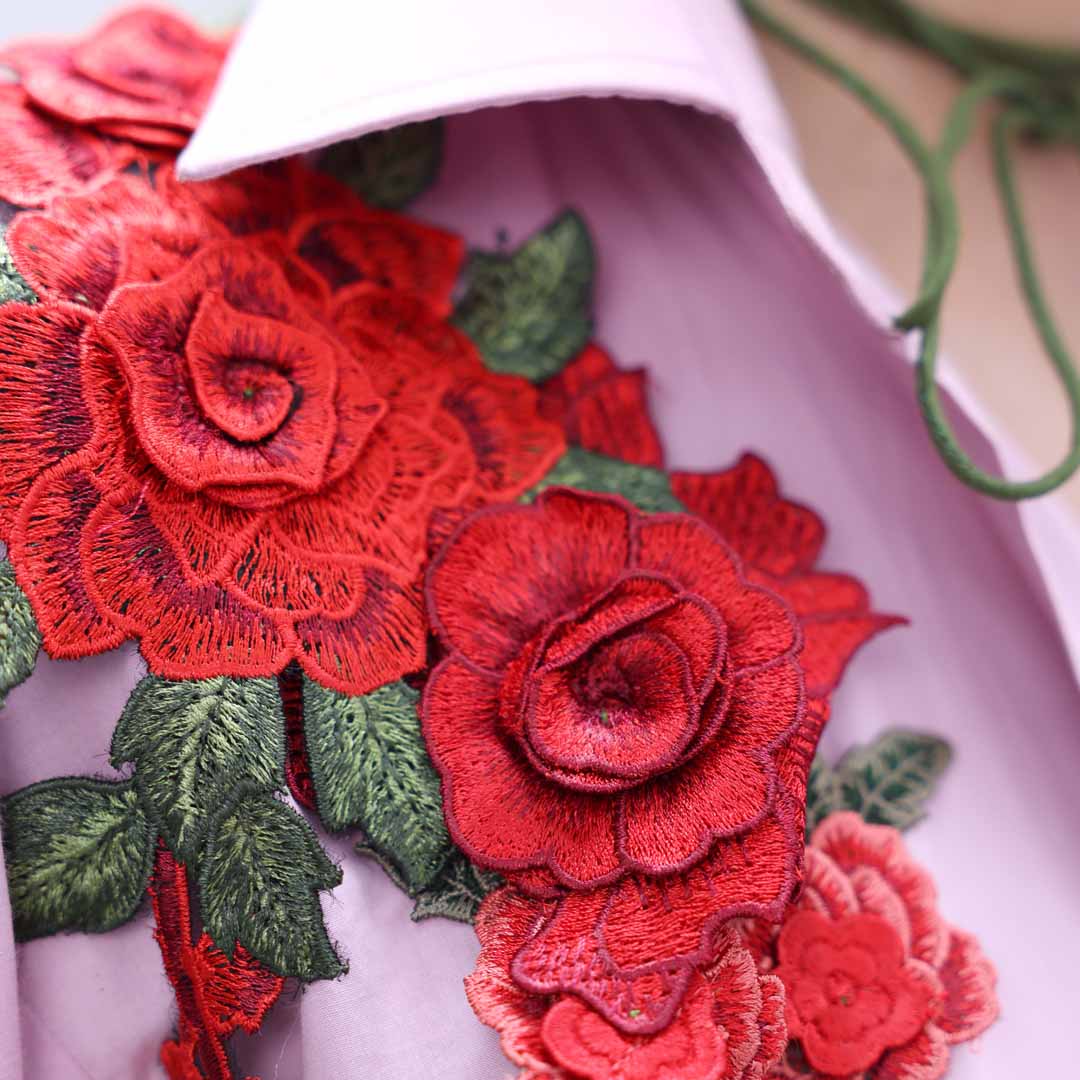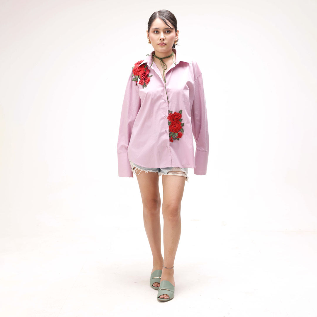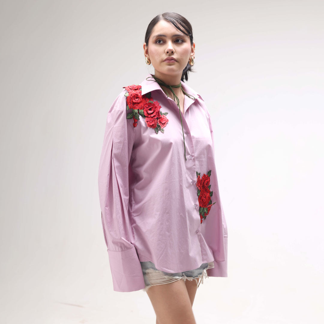 Add a touch of understated elegance to your wardrobe with our Rosarium oversized shirt. The intricate detailing and refined cut exudes class and sophistication. Made with the finest lavender fabric, featuring delicate rose flower accents, a drawstring neck for a bow effect, and intricate sleeve and cuff details. Feel both comfortable and stylish in this exclusive, luxurious addition to your wardrobe.Its a must-have for any fashion-forward individual. Elevate your style with this timeless piece.