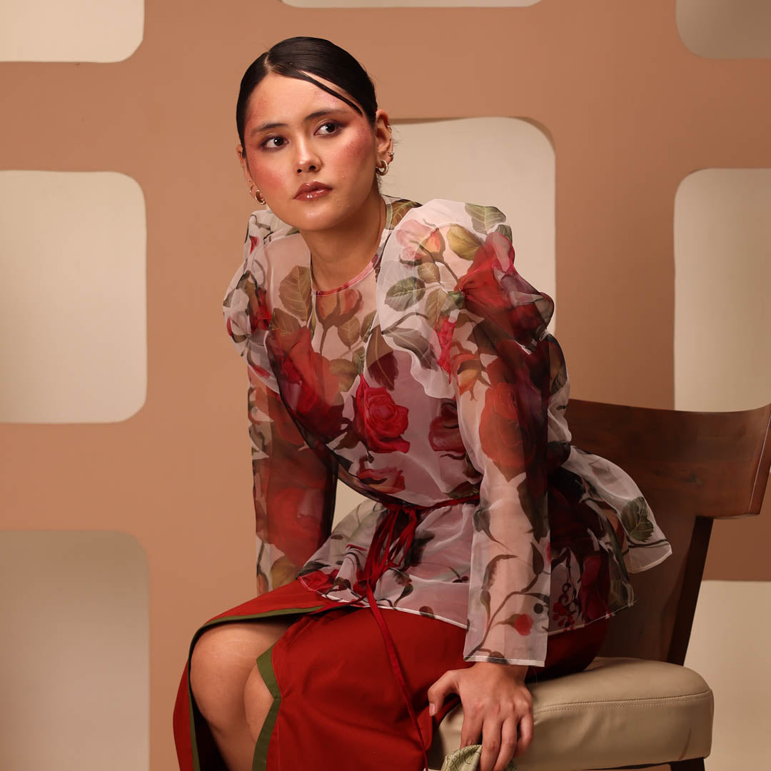 Whisper sweet nothings in this ethereal Whispering Petals top. Crafted from lightweight organza, with intricate details on the sleeves, this top is the epitome of elegance. Perfect for any occasion, let your inner flower child bloom in style.