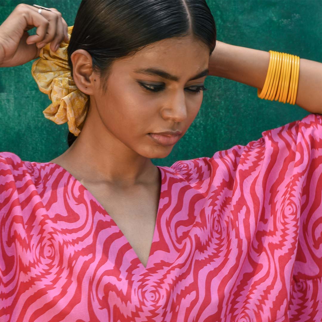Introducing the Zinnia Scrunchie, a sustainable hair accessory made from organic cotton and production waste. Its yellow hue and textured fabric adds a touch of style, while helping to reduce waste in the fashion industry. A conscious choice for both your hair and the environment.