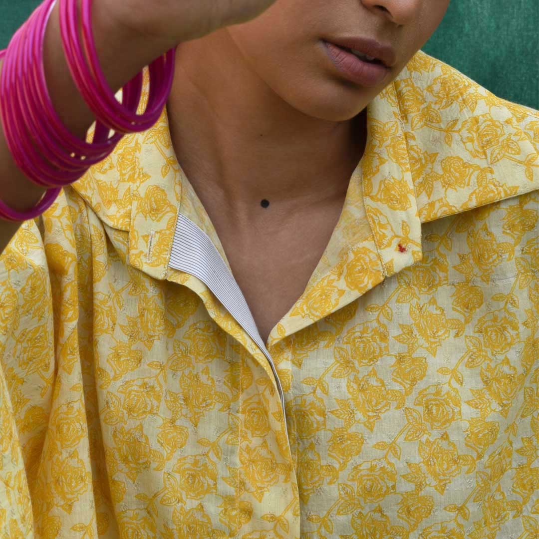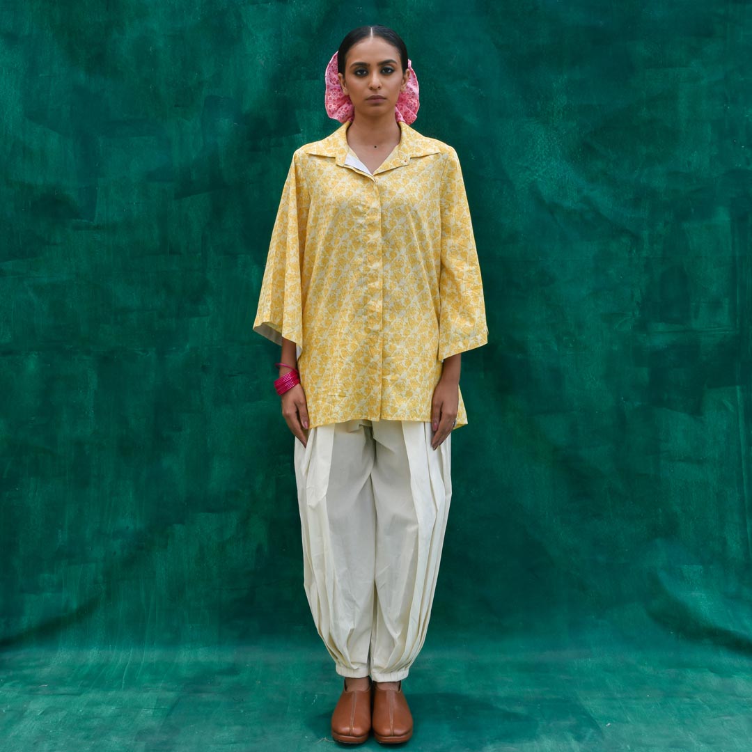 Step out in style with our Manjal Top! Made from soft and sustainable organic cotton, this top features a classy yellow print and an oversized fit for ultimate comfort. Elevate any outfit with this versatile and eco-friendly top.
